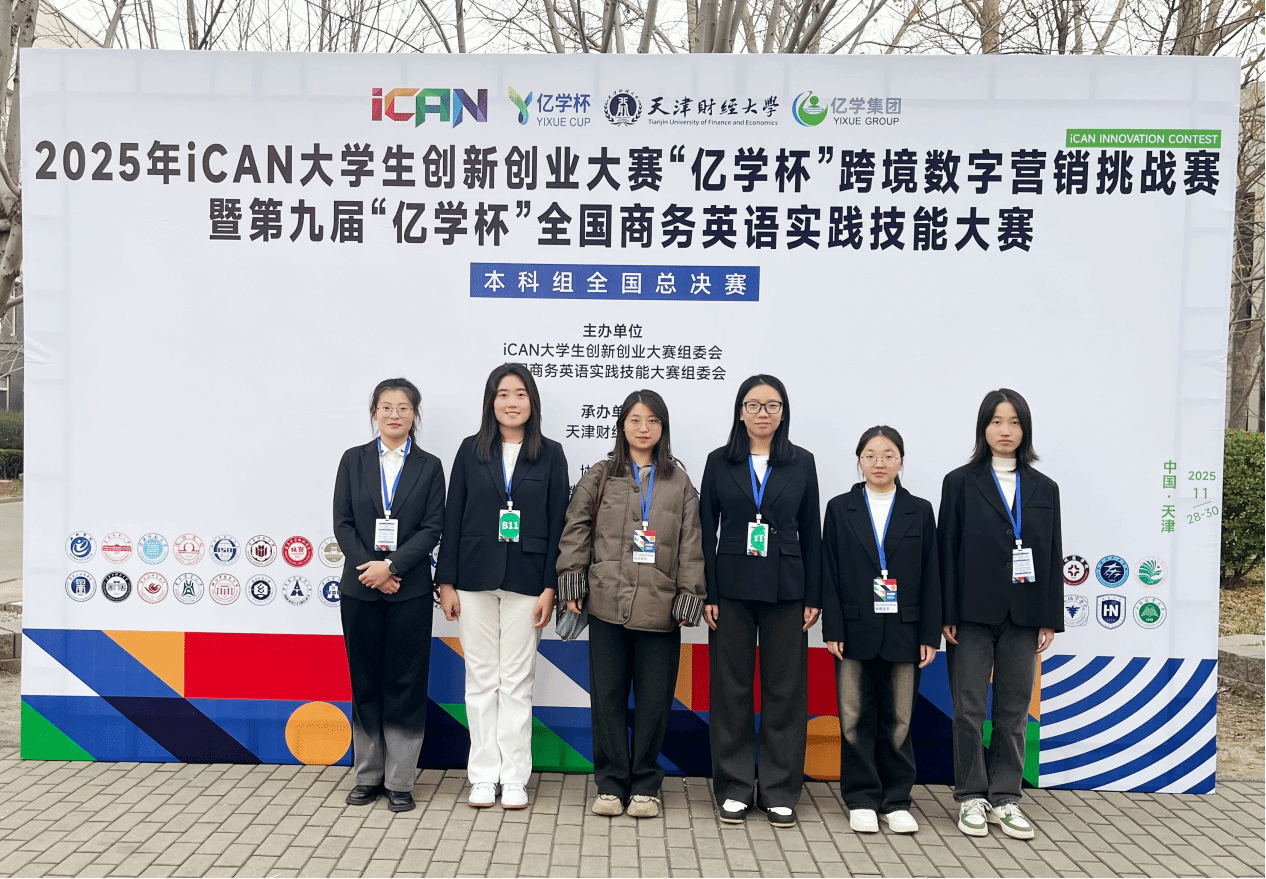 11月29日,2025年iCAN大学生创新创业大赛“亿学杯”跨境数字营销挑战赛全国总决赛在天津财经大学圆满落幕,由我校外语系陈新老师指导,商务英语专业学生申鑫南,舒君娜,胡洋,杨嘉怡,张婧芸五位同学组成的参赛团队 www.91视频.com,经过多轮角逐,最终荣获全国三等奖。